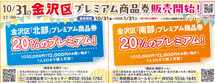 1口 10,000円で12,000円(20%のプレミアム分)のお買物ができる商品券です。(1人 3口迄)今回は、金沢区を2つのエリアに分けて販売します。